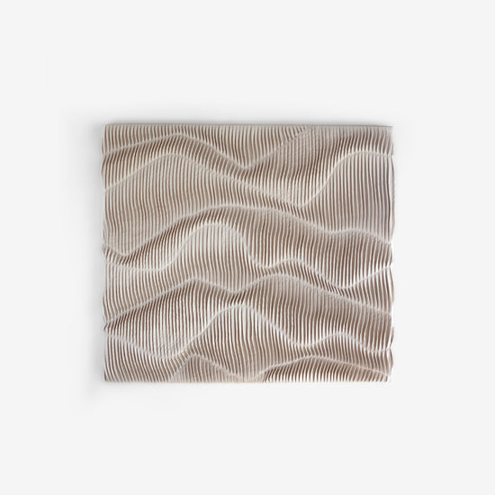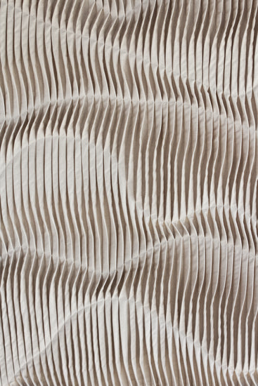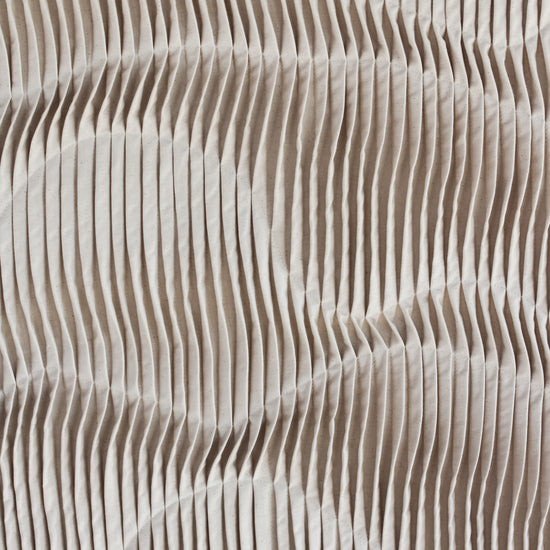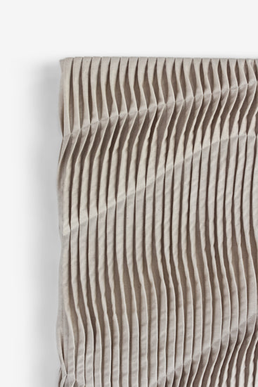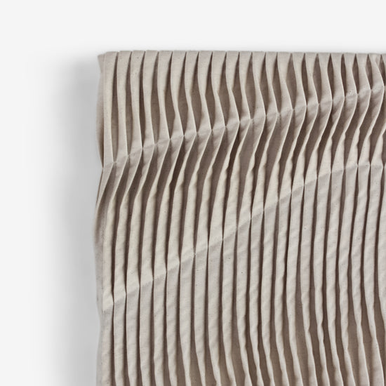 Morgan Young’s work is a natural evolution of her practice as a fashion designer and young figure skater. Her transition from fashion to fine art occurred after she had launched a high fashion line from reclaimed and deadstock fabrics and felt called to move towards a different expression of those materials. She began pushing the boundaries of canvas into a realm that expresses the form of a triple axel with the poetry and repetition of a vintage Singer. Deep pleats, patterned seams, and the vortex of visceral movement became her focal points, each work requiring a grueling physicality, the end result a serene and languid, almost nimbus iridescence flowing from the ripples of a once raw and rough fabric. Her latest collection Pleats, Please, Please is an homage to Japanese fashion designer, Issey Miyake.