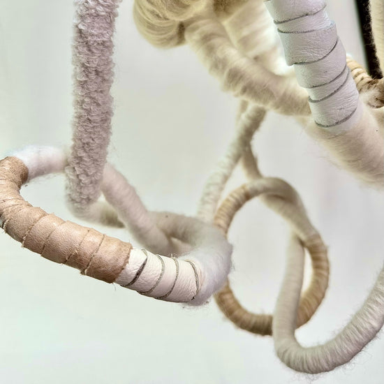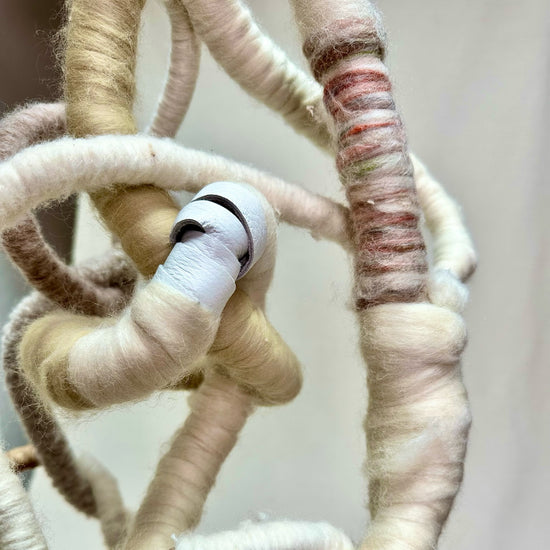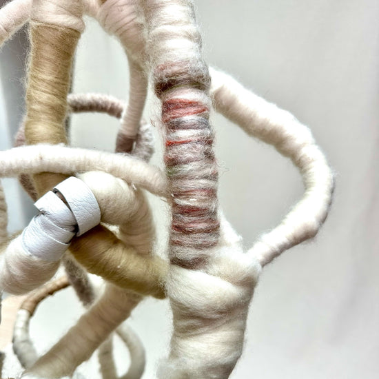 Natural cheviot wool roving and yarn wrapped roving, rope, upcycled leather