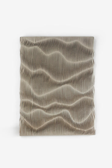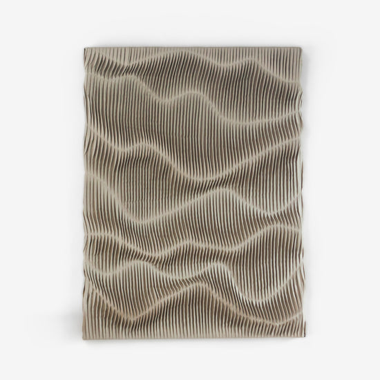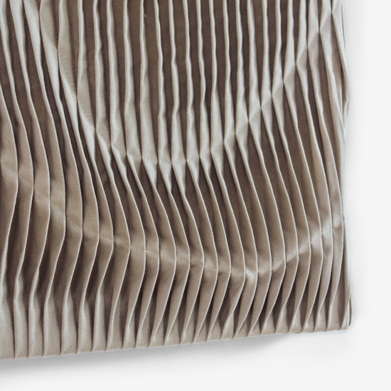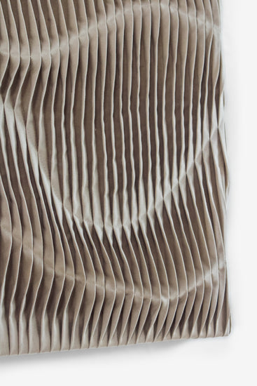 Morgan Young’s work is a natural evolution of her practice as a fashion designer and young figure skater. Her transition from fashion to fine art occurred after she had launched a high fashion line from reclaimed and deadstock fabrics and felt called to move towards a different expression of those materials. She began pushing the boundaries of canvas into a realm that expresses the form of a triple axel with the poetry and repetition of a vintage Singer. Deep pleats, patterned seams, and the vortex of visceral movement became her focal points, each work requiring a grueling repetition and physicality, the end result a serene and languid, almost nimbus iridescence flowing from the ripples of a once raw and rough fabric. Her latest collection Pleats, Please, Please is an homage to Japanese fashion designer, Issey Miyake.