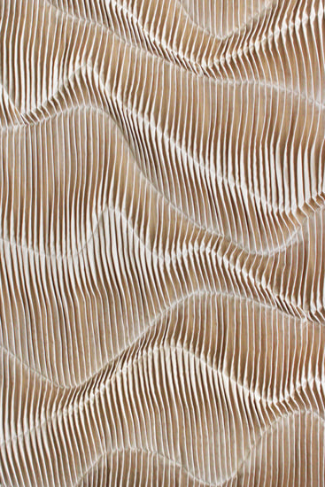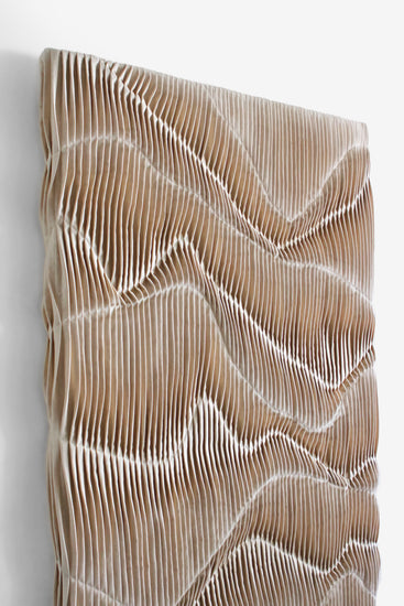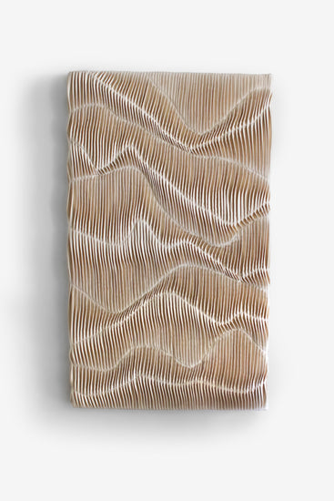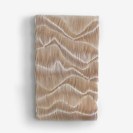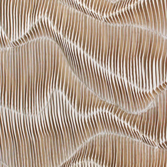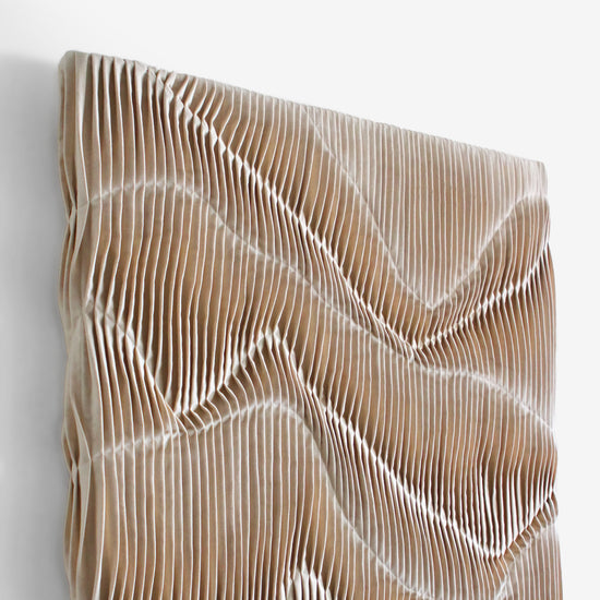Morgan Young’s work is a natural evolution of her practice as a fashion designer and young figure skater. Her transition from fashion to fine art occurred after she had launched a clothing line from reclaimed and deadstock fabrics and felt called to move towards a different expression of those materials. She began pushing the boundaries of canvas into a realm that expresses the form of a triple axel with the poetry and repetition of a vintage Singer. Deep pleats, patterned seams, and the vortex of visceral movement became her focal points, each work requiring a grueling physicality, the end result a serene and languid, almost nimbus iridescence flowing from the ripples of a once raw and rough fabric. Her latest collection Pleats, Please, Please is an homage to Japanese fashion designer, Issey Miyake.