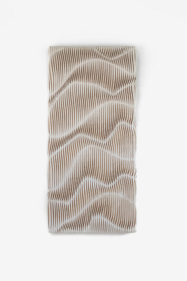 Morgan Young’s work is a natural evolution of her practice as a fashion designer and young figure skater. Her transition from fashion to fine art occurred after she had launched a high fashion line from reclaimed and deadstock fabrics and felt called to move towards a different expression of those materials. She began pushing the boundaries of canvas into a realm that expresses the form of a triple axel with the poetry and repetition of a vintage Singer. Deep pleats, patterned seams, and the vortex of visceral movement became her focal points, each work requiring a grueling physicality, the end result a serene and languid, almost nimbus iridescence flowing from the ripples of a once raw and rough fabric. Her latest collection Pleats, Please, Please is an homage to Japanese fashion designer, Issey Miyake.