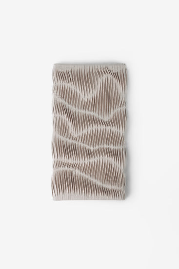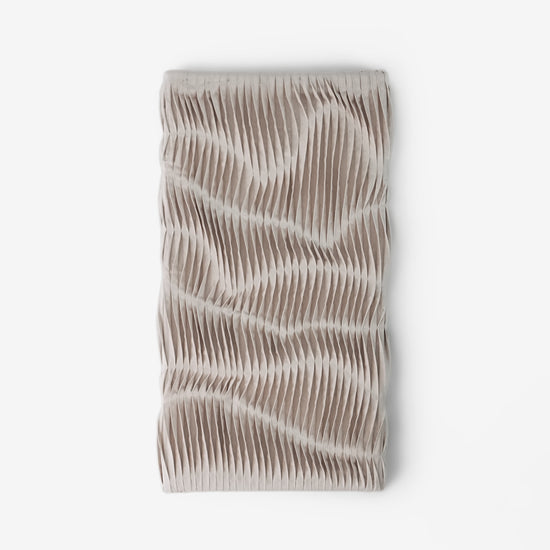 Morgan Young’s work is a natural evolution of her practice as a fashion designer and young figure skater. Her transition from fashion to fine art occurred after she had launched a high fashion line from reclaimed and deadstock fabrics and felt called to move towards a different expression of those materials. She began pushing the boundaries of canvas into a realm that expresses the form of a triple axel with the poetry and repetition of a vintage Singer. Deep pleats, patterned seams, and the vortex of visceral movement became her focal points, each work requiring a grueling physicality, the end result a serene and languid, almost nimbus iridescence flowing from the ripples of a once raw and rough fabric. Her latest collection Pleats, Please, Please is an homage to Japanese fashion designer, Issey Miyake.