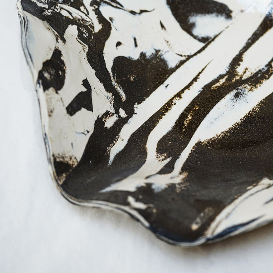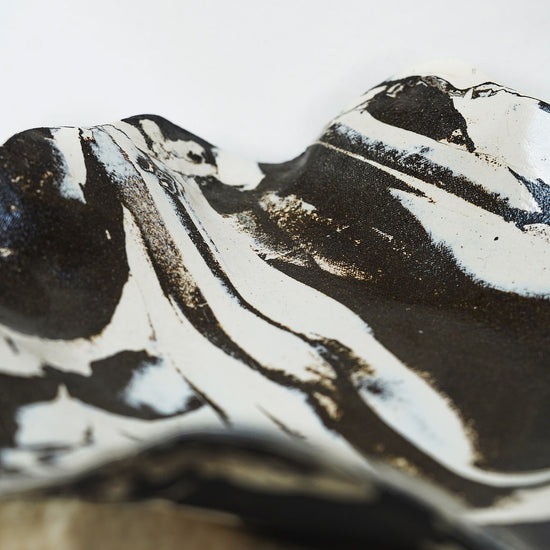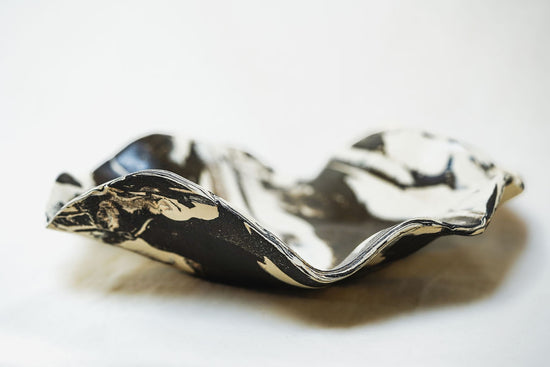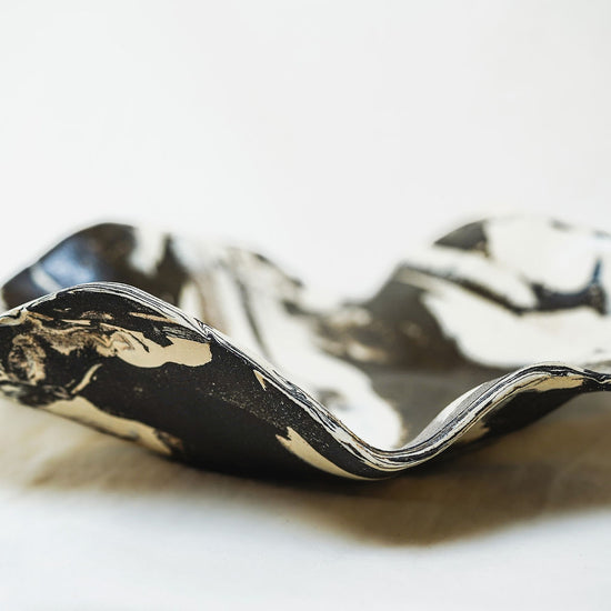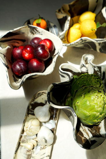 Danielle Hutchens is a Topanga Canyon-based painter and sculptor whose practice involves sourcing sustainable materials from her environment and exploring themes of play, the balance of masculine and feminine energy, and the pursuit of joy through slow, present living. We love her ingenuity and sourcing of recycled clay and stones to use as pigments, grinding them to powder and using water and walnut oils to create pigment. Her marbled collection emerged from a curiosity and exploration of two distinct colors that represent two distinct sides of herself, separate but blended, fluid and connected, not muddied. We love how the black and white flow together and how the curves of the collection mimic forms found in nature, from the crassostrea oyster to merulina coral, each piece functional and beautiful.