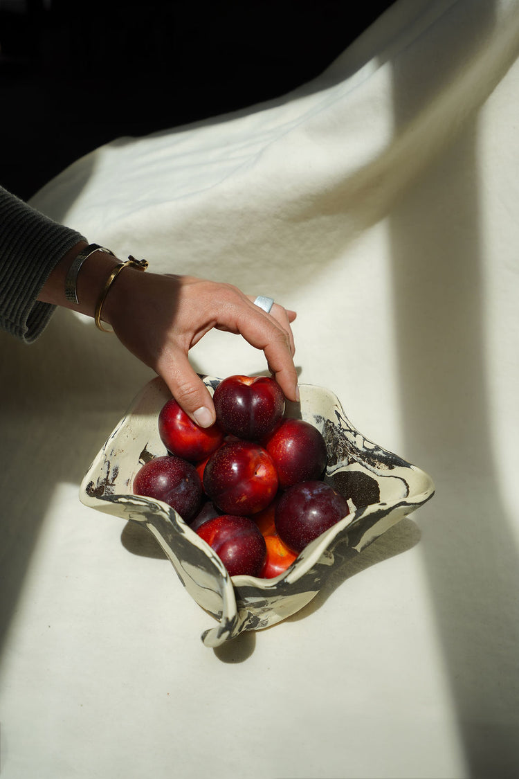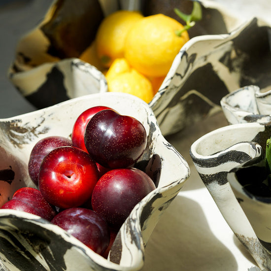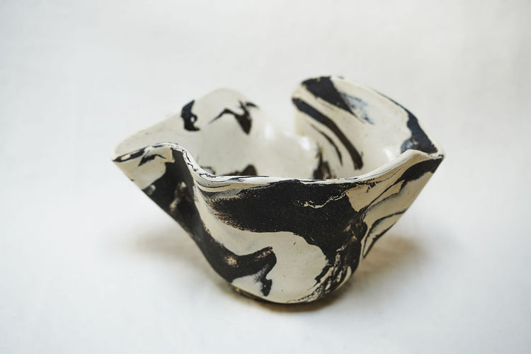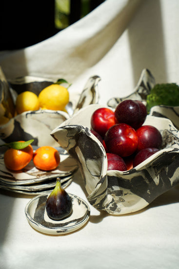 Danielle Hutchens is a Topanga Canyon-based painter and sculptor whose practice involves sourcing sustainable materials from her environment and exploring themes of play, the balance of masculine and feminine energy, and the pursuit of joy through slow, present living. We love her ingenuity and sourcing of recycled clay and stones to use as pigments, grinding them to powder and using water and walnut oils to create pigment. Her marbled collection emerged from a curiosity and exploration of two distinct colors that represent two distinct sides of herself, separate but blended, fluid and connected, not muddied. We love how the black and white flow together and how the curves of the collection mimic forms found in nature, from the crassostrea oyster to merulina coral, each piece functional and beautiful.