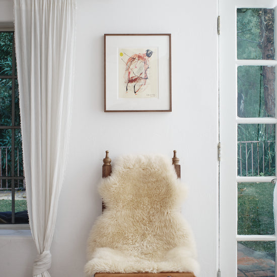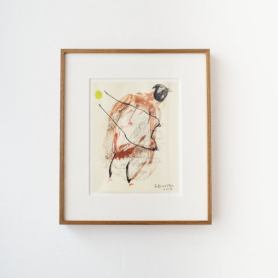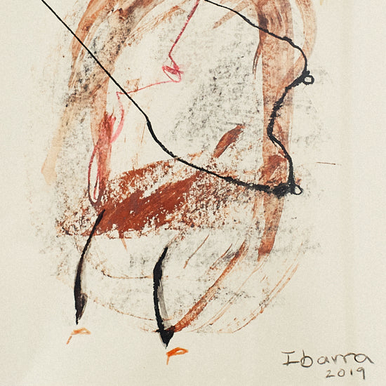 Elizabeth Ibarra was born and raised in Guadalajara, Jalisco, México and lives and works in Los Angeles, California. Many of Ibarra's works feature figures like the one pictured here, human, yet alien-like and in this painting, somewhat maternal even. She refers to these figures as her "creatures" and they could represent the experience of being a foreigner with an outside perspective or simply the feeling of loneliness. Traces of Joan Miro and Louise Bourgeois, two of our other favorite artists, are also visible in her work, which we love. Ibarra is honest, at times silly and other times sardonic in person and in her painting. She is inspired by connectivity, simple imagery, and cosmology.