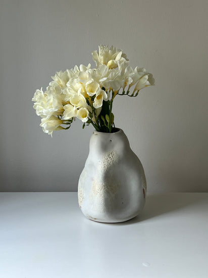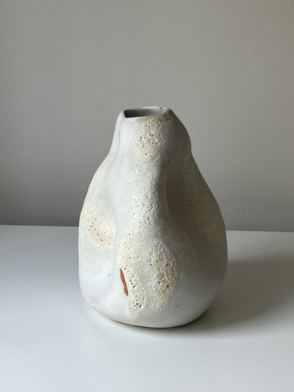 The White Lava Vase is unglazed and textured on the outside to show the beauty of the natural clay and glazed on the inside for holding water. Can exist as a stand alone sculpture or be used to hold dry or fresh flowers